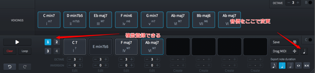 これ、どういうところが強力かというと、市販のコード譜を使ったり出来ることですね。いい感じのコード進行が出来るまで、ここでループさせるのもありだと思います。