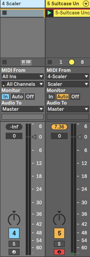 鳴らしたい音源の方はアームボタンを押して、MIDI Fromは当然、入力タイプはScaler,入力チャンネルもScalerにします。