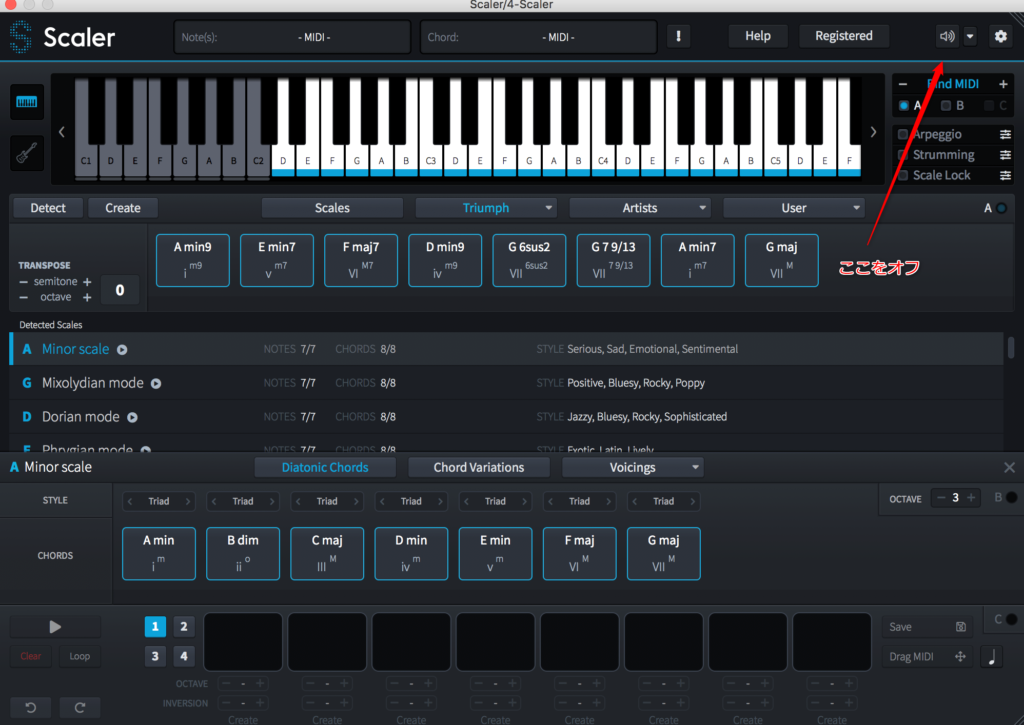 自分のボイシングを考えたい場合でも、ScalerにMIDI入力するようにすればフレーズを作れるので、作曲支援にもつかえますね。