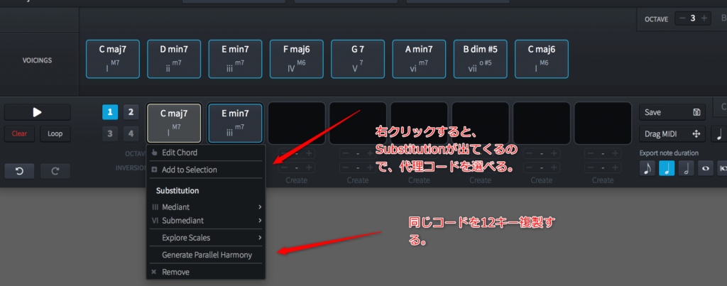 ここで右クリックすると、使える代理コードが出てきます。Mediant,Submediantは日本の理論書では多分、あんまり書かれないと思うんですが、コード理論大全には書いてあります。