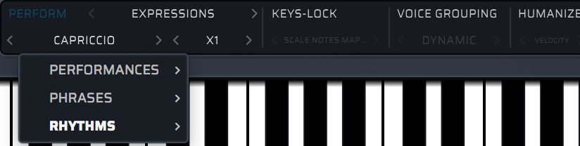 また、ちょっとおもしろいのがRhythmです。一定のリズムパターンで再生してくれます。自分でリズムパターンが手癖になっちゃうような場合にアイデア出しで使っても面白いと思います。