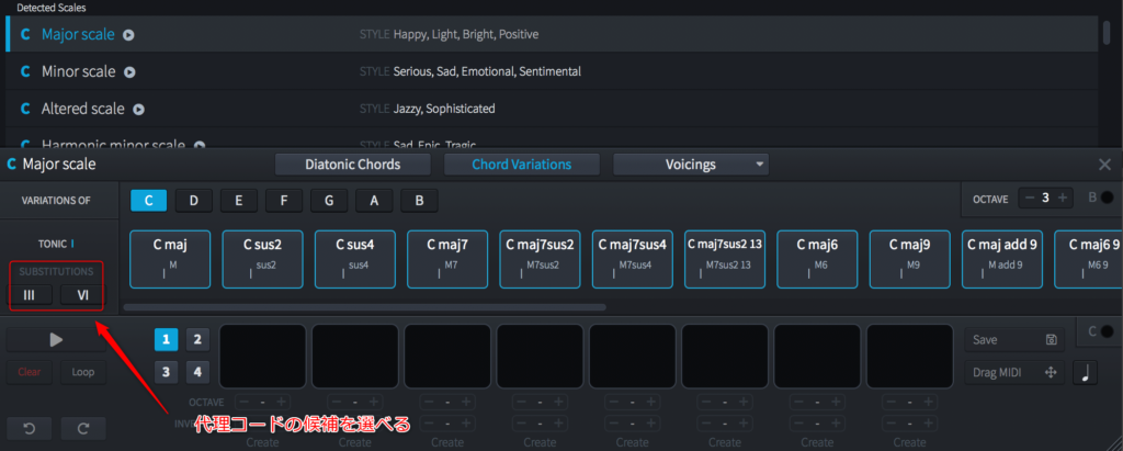 Chord Variationsを押すと、代理コードの候補なんかを上げてくれます。