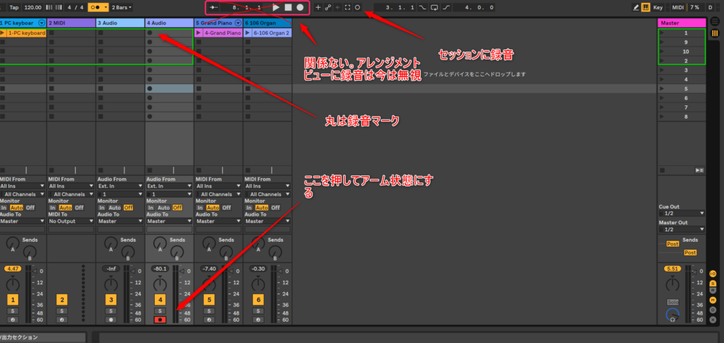 オーバダビングする時どうするのって疑問があるよね。その時は、アーム状態にしてからセッション録音ボタン押せばに録音できるからね。アレンジメントビューと操作が違うから、ちょっと混乱しやすいかもしれんね。