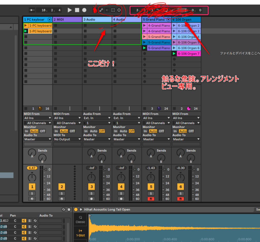 この2つを理解したら、後々、セッションビューとアレンジメントビューを行き来するようになっても理解できる。