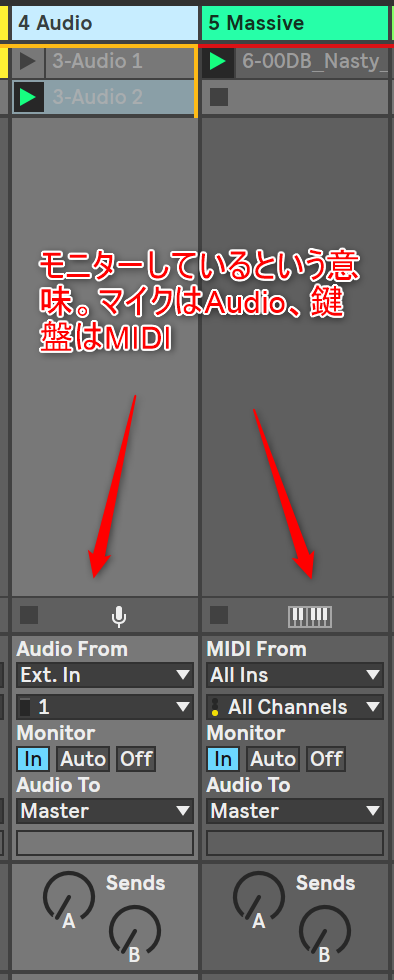 これはちょっと録音だけとは違うけれど、モニターって意味やね。MIDIトラックかオーディオトラックのトラックか確認するのが簡単やね。