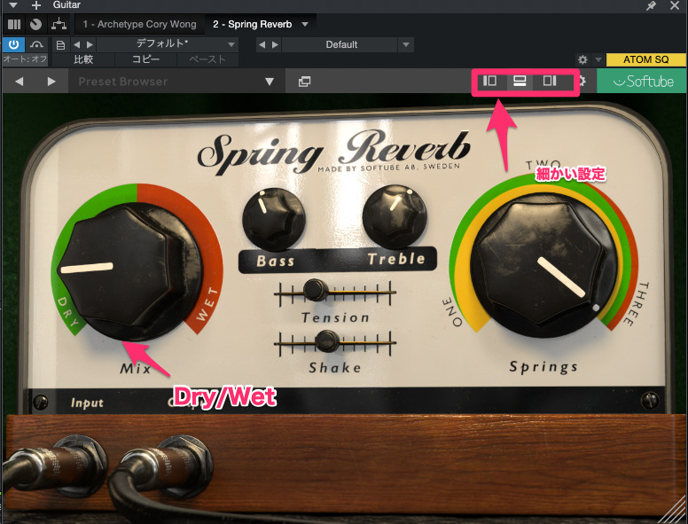スプリングリバーブがついてない、Archtype:Cory Wongを立ち上げて、その後段に挿しました。ちょっと上品なサウンドが欲しかったので、Springを3本。