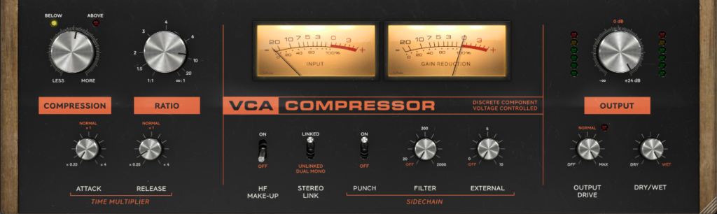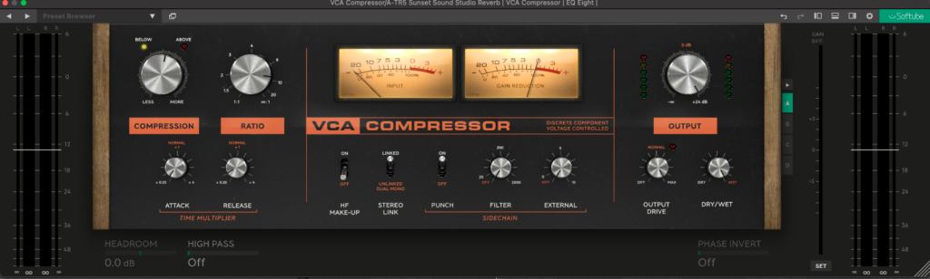 UADからも出ていますし、WAVES、あと、Studio OneのFatChannel XTでもあります。SoftubeのVCA Compressorが一番のお気に入りです…