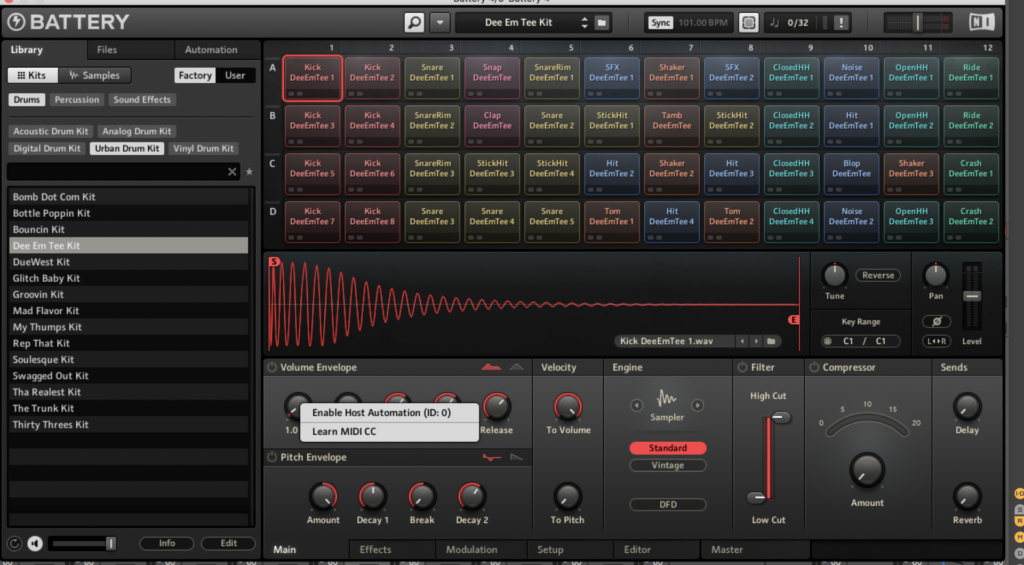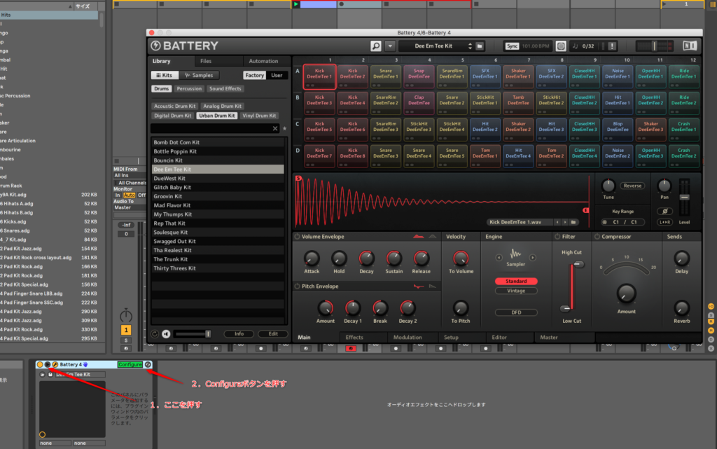 先日、PUSH勉強会をやってきた時、Kurtさんは、ドラム音源はBatteryを使うとおっしゃってたんだよね。