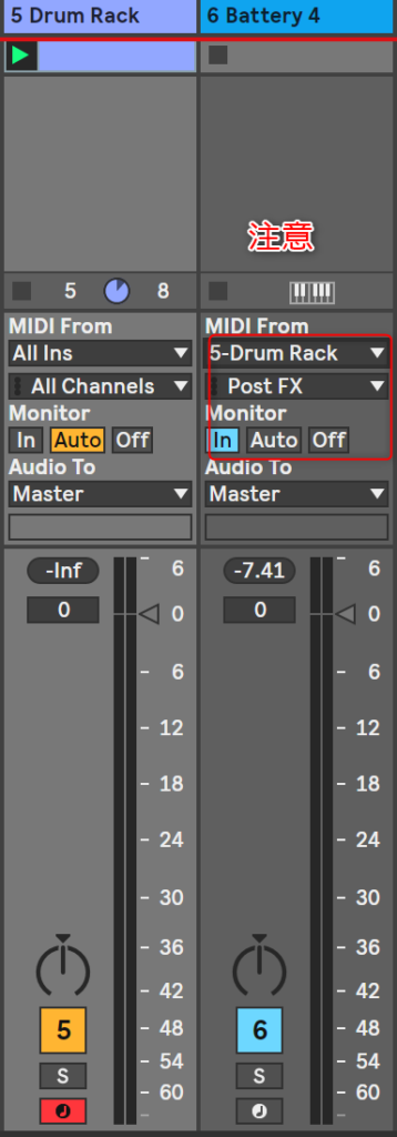 注意するのは、Battery側のMIDI FROMをDrumrackにすること。それと、Monitorをinにすることやね。