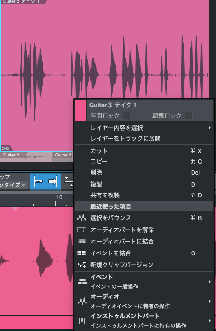 Studio Oneの場合はオーディオイベント(Abletonのクリップに相当するもの)をひとまとめにする場合は「グループ化」と「オーディオパートに結合」があります。