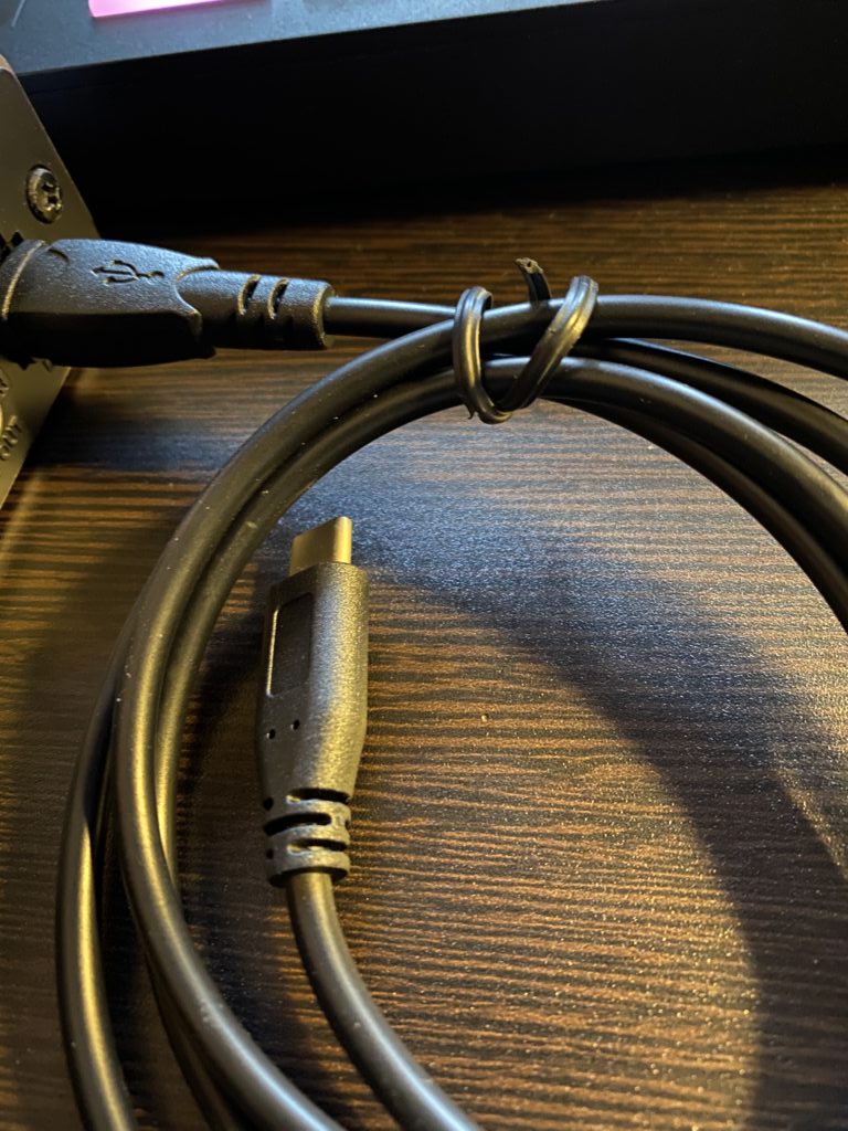 純正のケーブルだと長さがある。スタジオに持っていくとか、ある程度PCと離れる前提なら長くてもいいけど、設置から収納まで早くできる方が楽。