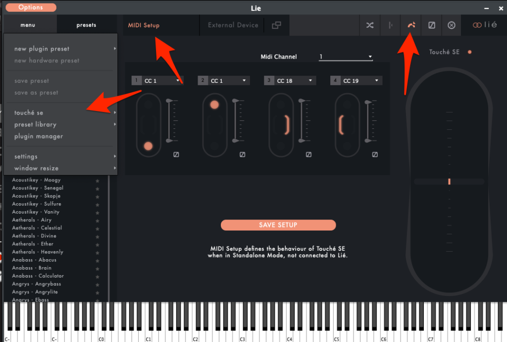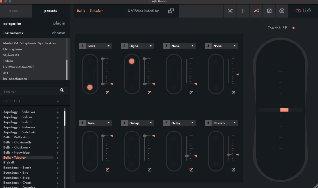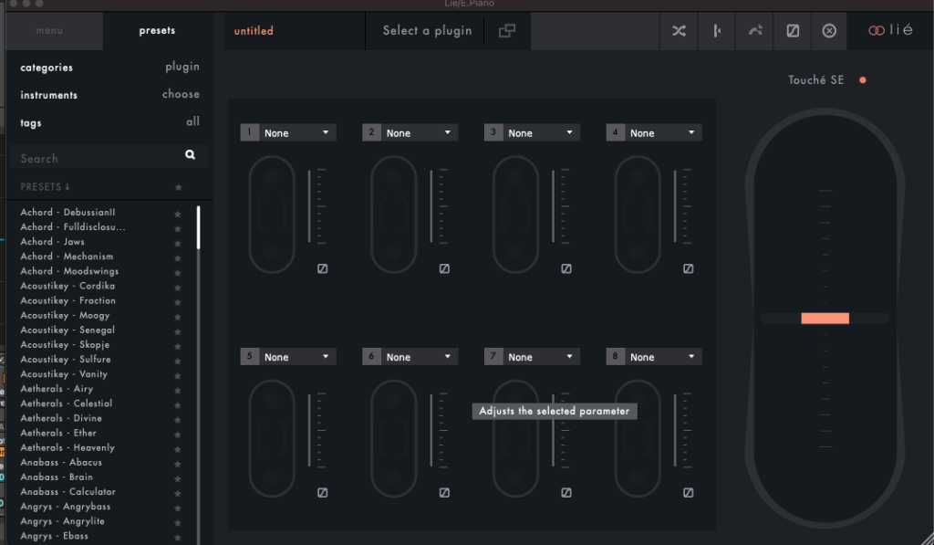 TouchéにはLieというTouchéをコントロールするソフトが付いています。これにプラグインを読み込んでパラメーターをコントロールするようになってます。