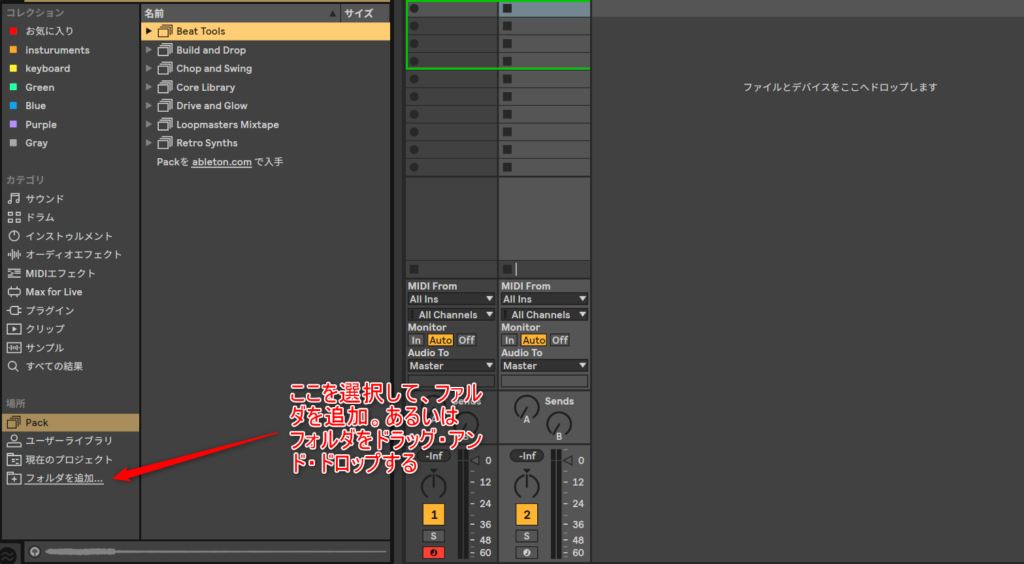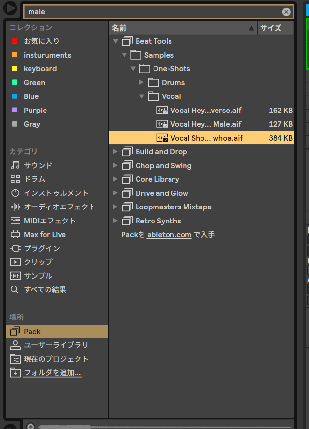 だから、Ableton Liveに付属しているものから選ぶ場合は、Packを選択してサンプルを選ぶことになるね。