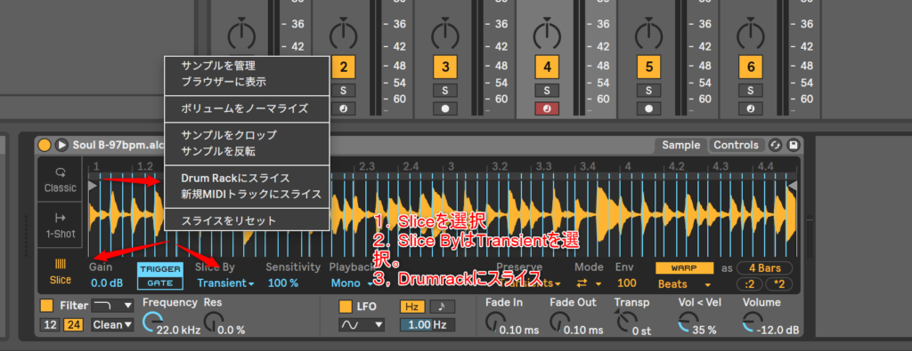 右上のSlicingでTransientを選べば自動で切り分けてくれる。切り方が気に入らなかったらSensivityの割合を変えたらいい。