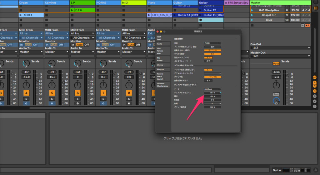 やりかたは2つあります。Abletonの環境設定からLook Feelを選択。「ディスプレイをズーム」で倍率を上げればいいですね。これで安心です…