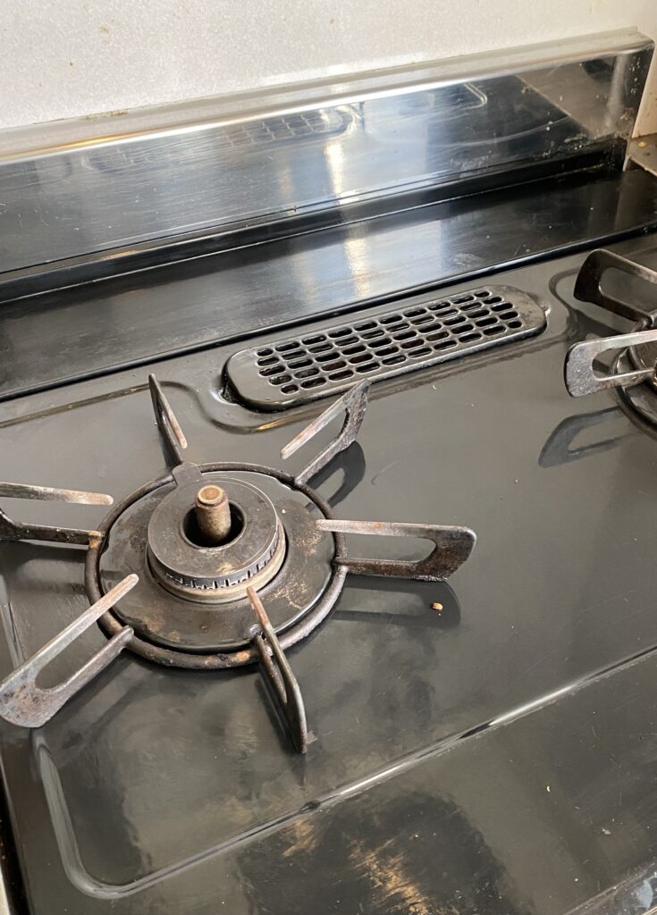 で、金属製のスポンジなどで磨いて拭くとこうなります。五徳の周りなんかは研磨剤使ってやらないと駄目ですけど5分でさっと掃除できると考えたら手軽でいいですね。