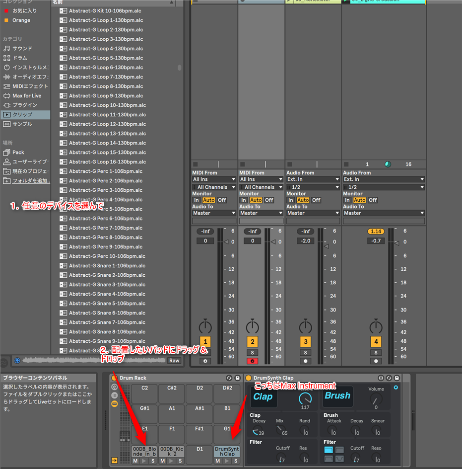 - Ableton Liveの内蔵音源 これもDrumrackのパッドにアサインできるよ Drumrackも当然入る。楽器って意味やからね。重複していてわけわからんくなるかもしれんけど、ドラムは優先度が高いから別カテゴリになってるんや。