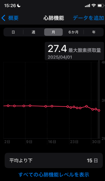 かなり歩けていたから健康の基準にしているVo2Maxは改善されるかと思っていたんですけど、今まで一番悪い数値となりました。無念。もっと強度が高いトレーニングしないと落ちる一方ですね。