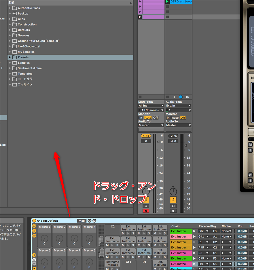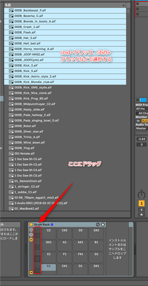 でも、普通に選択して、DrumRackのパッドにドラッグ・アンド・ドロップしてもできない。絶望や!となるかもしれないけど、大丈夫。できますよ…
