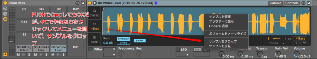 で、たくさんのサンプルの長さを変えたり、編集したりするときは、Drumrackにいっぱいサンプルを読み込んで編集すると、トラックをたくさん作らなくていいから便利だよね。