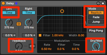 - ディレイタイムをコントロールする必要があるので、Ableton側とテンポが同期していたらこまりますね。ですから、SyncではなくてTimeにします。