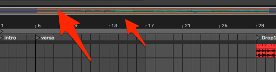 また、オーバービュー、小節の上で左クリック+ドラッグで横軸の拡大縮小も出来ます。拡大鏡マークにカーソルが変化します。
