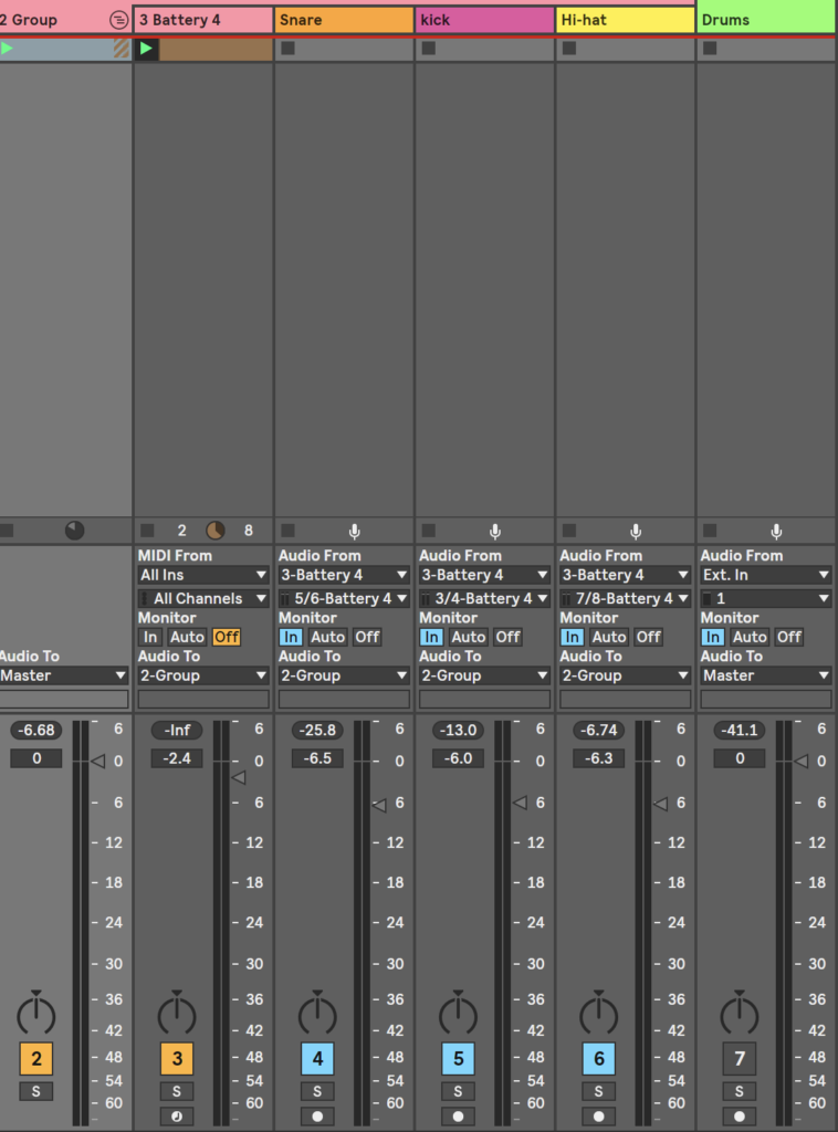 そして、それぞれパラアウトして、加工するんだから、BatteryのトラックのMonitorはオフにすればいい。わざわざそのまま鳴らす必要はないからね。
