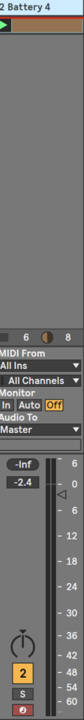 そして、Ableton Live側でオーディオトラックを作って、Audio FromをBattery4を立ち上げたチャンネルを指定。Monitorはinにする。それからDirect Outで指定したトラックを選べば音は出る。