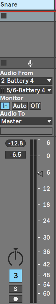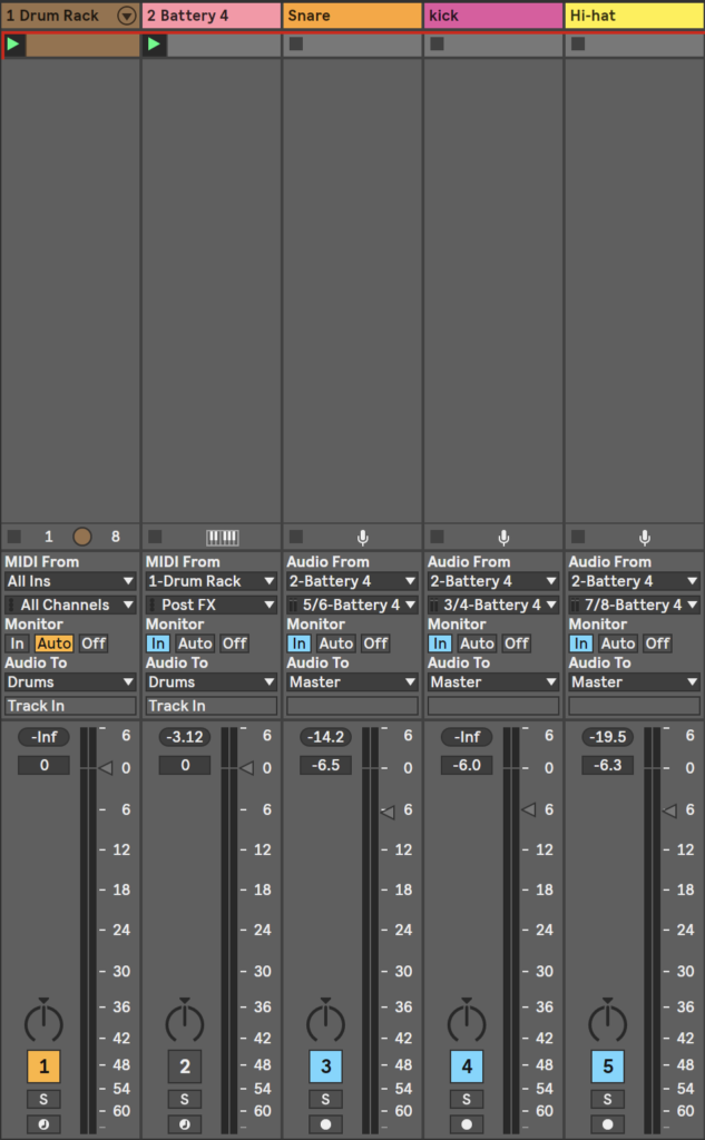 で、そのトラックの入力をDrumRackに指定する。Monitorはインだね。これで、Batteryからの音は出るんだけど、スネアはスネア、キックはキック、ハイハットはハイハットでエフェクトを掛けたりはできない。