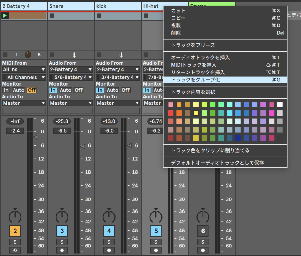 で、トラックをパラアウトしたものとBattery4を立ち上げているものを選択する。Cmd+クリックで選択してもいいね。で、右クリックしてトラックをグループ化としてもいいよね。ショートカットはcmd+Gだよ。ラックを作るときも共通だから覚えると便利やね。