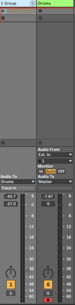 で、さっき作ったグループトラックのAudio Toを「Drums」にしました。これで録音準備はOK。セッションビューで録音するなら、Drumsの録音ボタンを押して、Groupを再生して録音すればいい。あるいは、アレンジメントビューにsのまま録音してもいいよね。