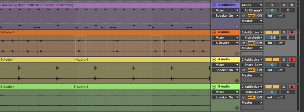 Audioトラックを新たに作って、入力をAddictive Drums 2 にして、任意のものにする。この場合はkick,Snare,Hi-hatとパラアウトしてあるよ。