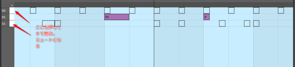 元のトラックのスネアをオフにする。この場合だと、D1を押して「0」キーを押してスネアをミュートした。