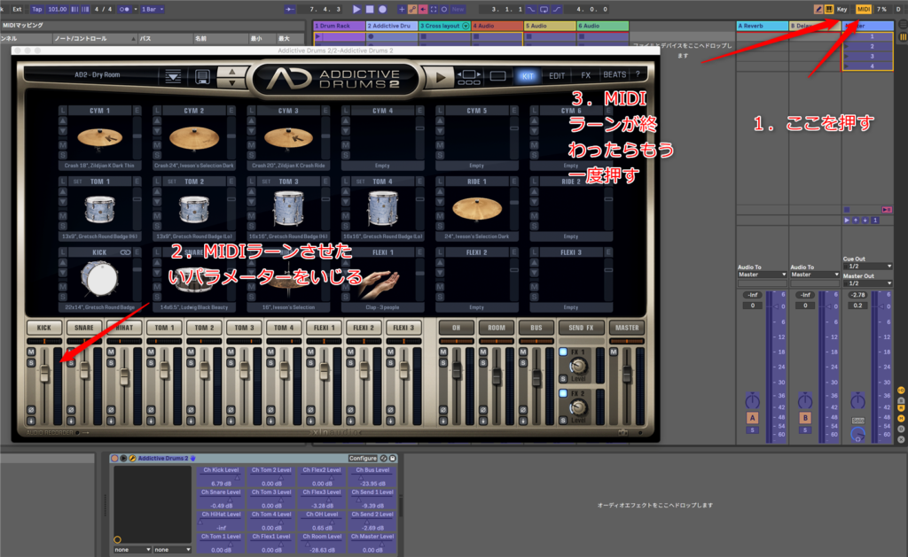 - Addictive Drums 2でコントロールしたいパラメータをいじる