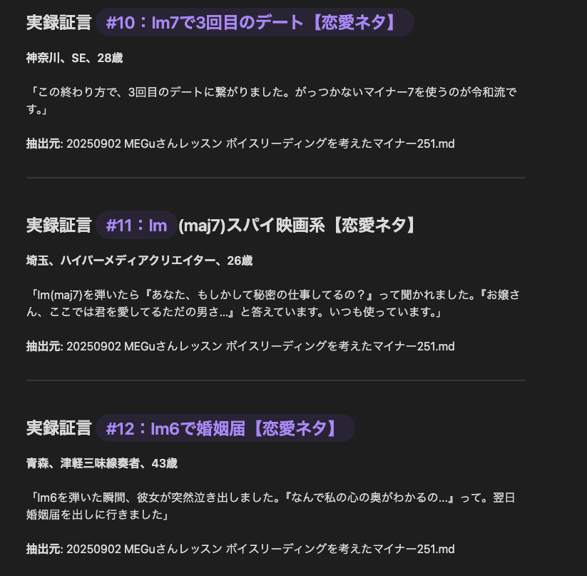 記事を自動生成みたいなのも実験してみましたけど、少なくともブログにはいらないのがわかったのは良かった。レッスン記事なんかは構造化して出力したものをみながら、書いてないことを書くというスタイルが確立しました。