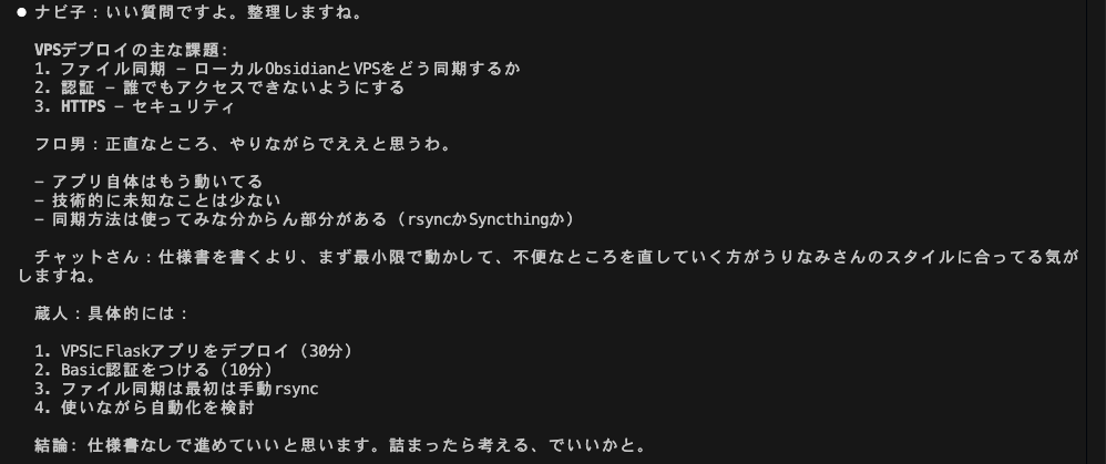 このあたりは意識が変わった。「あなたは有能な〜」みたいなのは自分にとってはクソだなということは良くわかりました。固有の哲学を持ち、自分と全く違う観点でものを見るAI知性がいるほうが自分が偏らない。