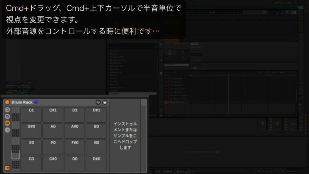 小ネタです。 cmdキーを押しながらドラッグ、またはCmdキーを押しながら上下カーソルでDrumrackの始点を変更できます。デフォルトではC1ですが、任意の場所をパッドの始点に設定できるということですね。 MaschineなどC1から始まらないものなど使う時に便... -