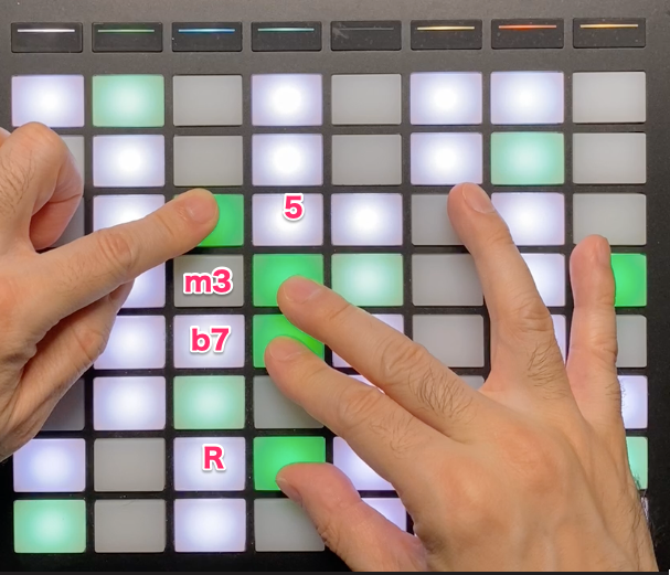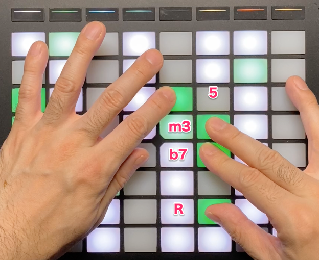動画ではドミナントマイナーのFm7で弾いてます。原曲ではホーンも入ってますし、3度弾かなくても全体としてはF7(#9)的に聴こえりゃいいやろという解釈です。