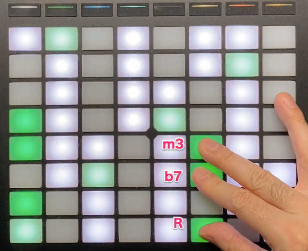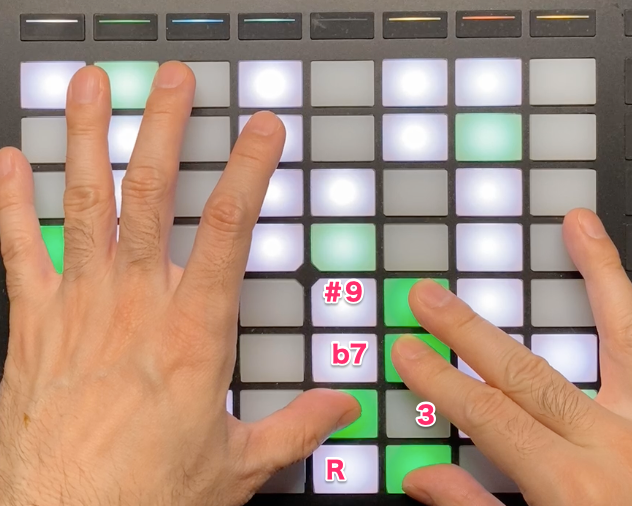 動画ではドミナントマイナーのFm7で弾いてます。原曲ではホーンも入ってますし、3度弾かなくても全体としてはF7(#9)的に聴こえりゃいいやろという解釈です。