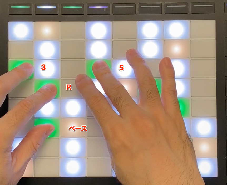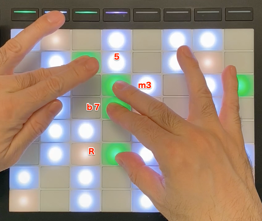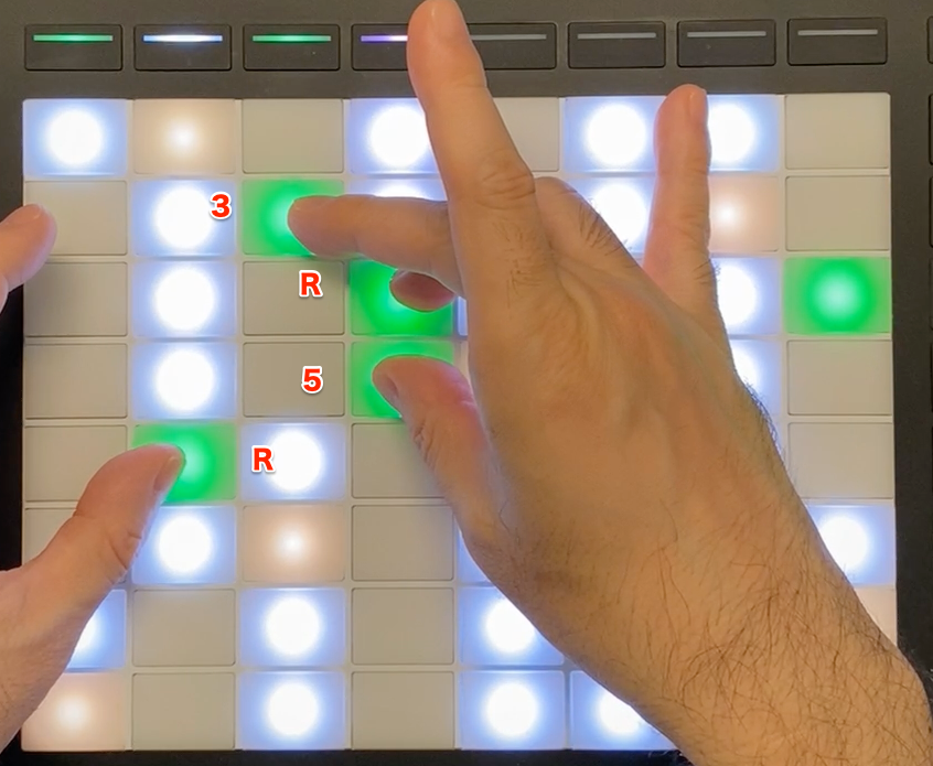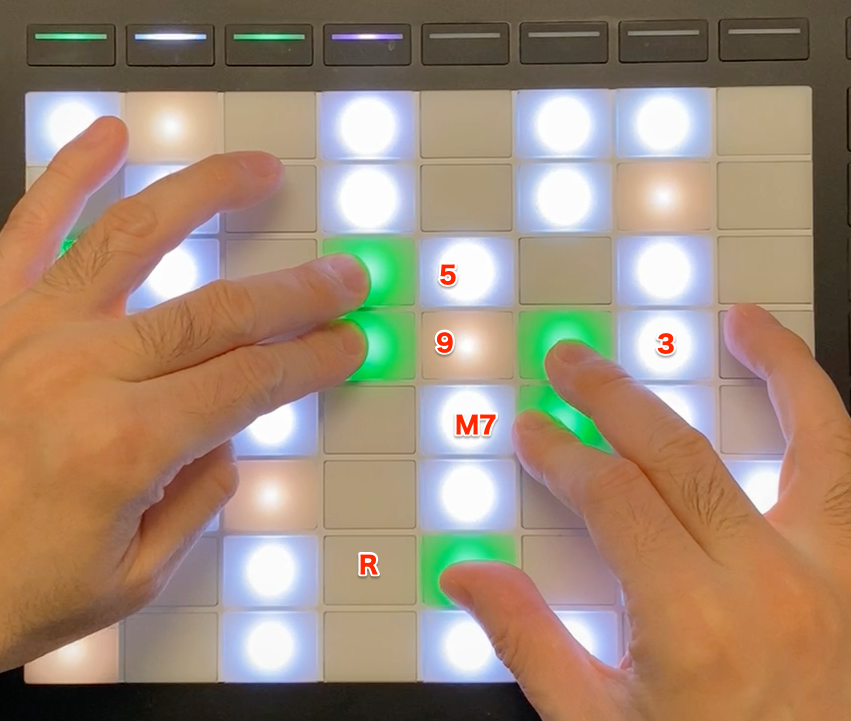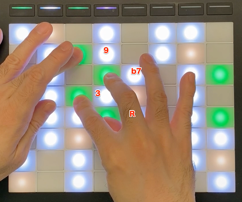 右手で137のシェルを作って、左手でテンションを入れています。鍵盤なら左手でシェルを作るのが普通ですが、パッドの場合はこうするのが楽に弾けると思います。セカンダリー・ドミナントでもあります。