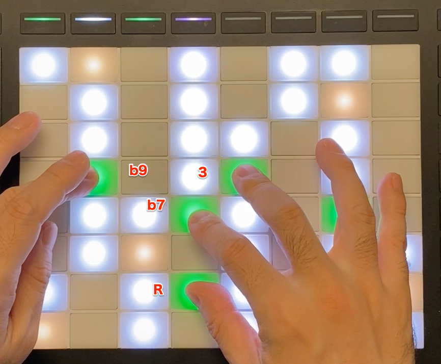 右手で173を押さえているのは、ローが濁らないようにするためです。b9は特徴的なサウンドですね。