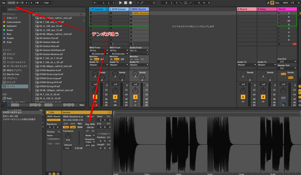 ちょっと見てくれるかな。これ、Ableton Liveのマスターテンポが120で、読み込んだクリップはBPM160になってるよね。