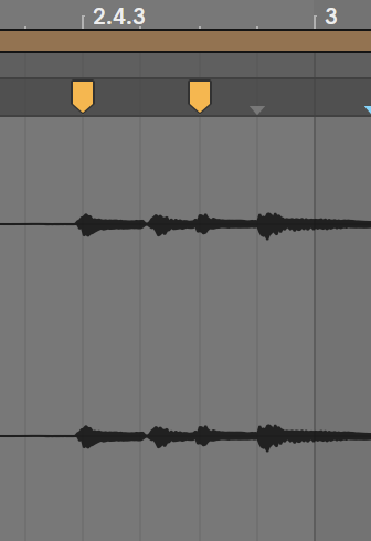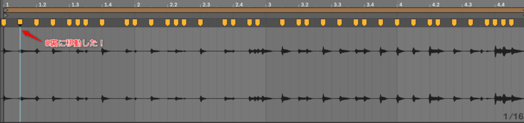 はい、じゃあ、この2つ目のワープマーカーを1小節目の3拍目まで動かしたとするよ。こうなるわな。