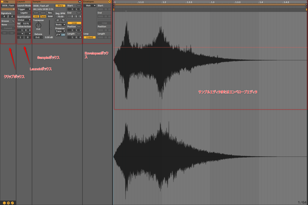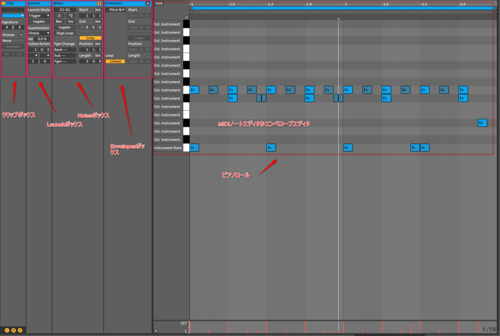 クリップボックス、Launchボックス、Envelopeボックスやね。ただ、Envelopeについては、オートメションを編集するところやけど、AudioとMIDIでは当然違うよね。