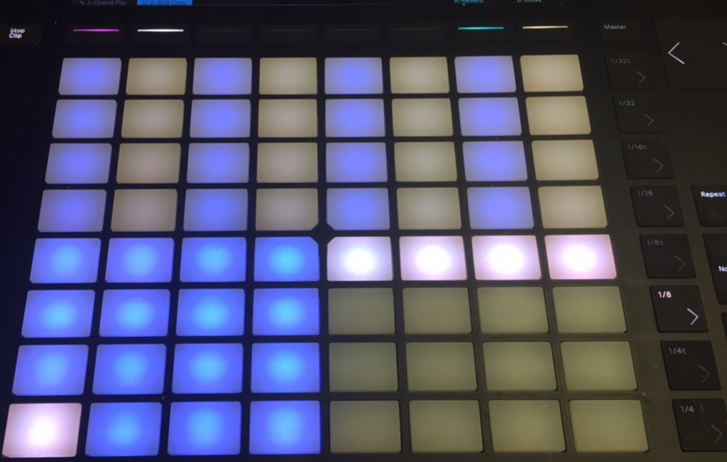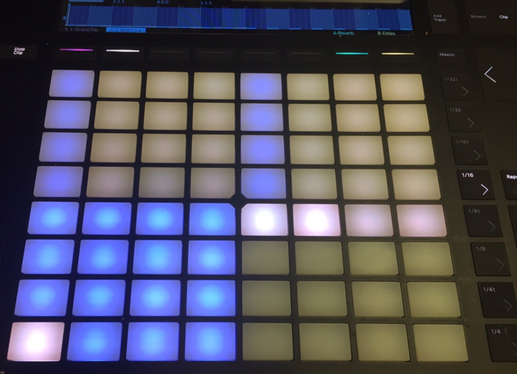 ハイハットはドラム譜ではこう表現されているけど、Ableton PUSH2をつかってグリッドを16分音符にして打ち込んだららこうなる。
