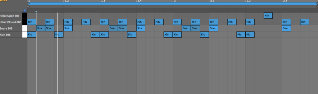 この譜面だとハイハットの最小音価は八分音符なので、Abletonで入力する場合、グリッドを1/8にして打ち込めばシンプルですね。