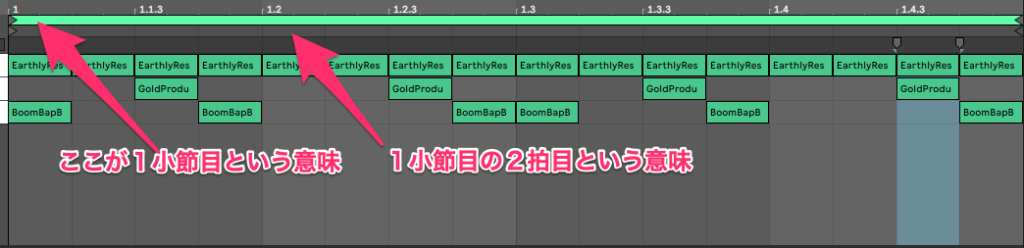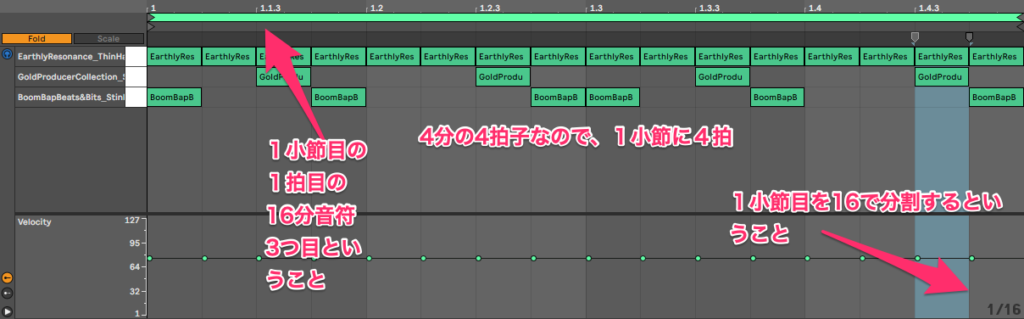 ちょっとわかりにくいが1.1.XなどのXはその拍の16分音符の何番目かを指している。