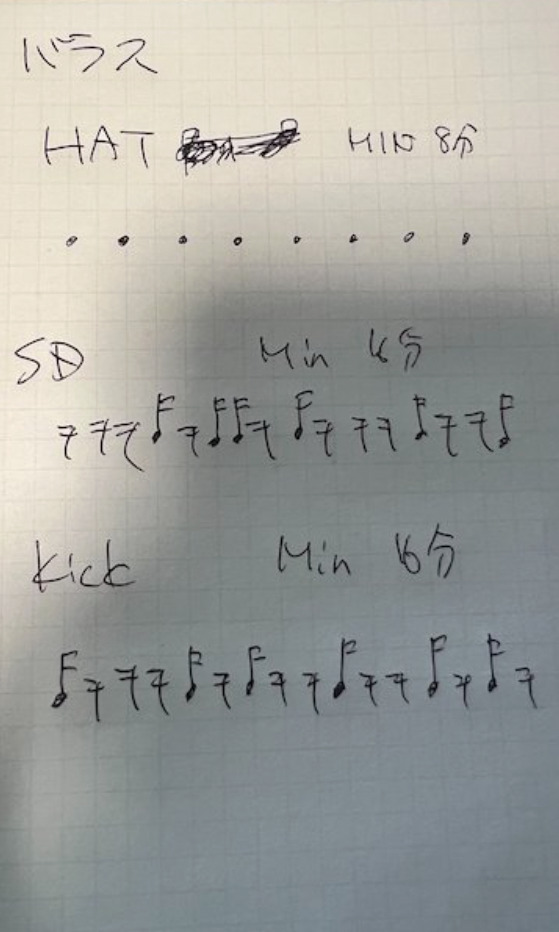 aoakebonoさんはドラムスの各パーツごとに最小音価を考えたらわかりやすいんじゃないかとおっしゃっていただいて、確かに慣れてない方はその方がわかりやすそうですね。