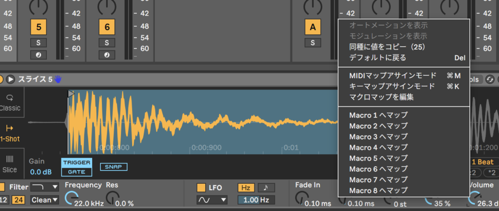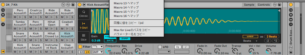 simpler上で、設定をすべてのサンプルに適用したい場合、適用したいパラメータのところで右クリックして「同種に値をコピー」すればいい。