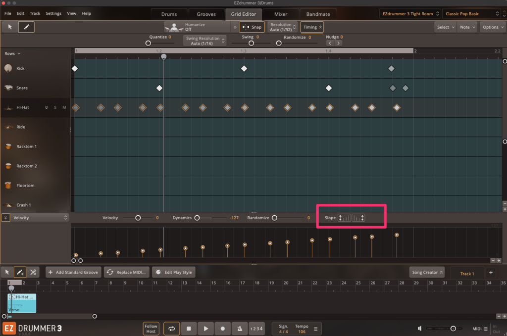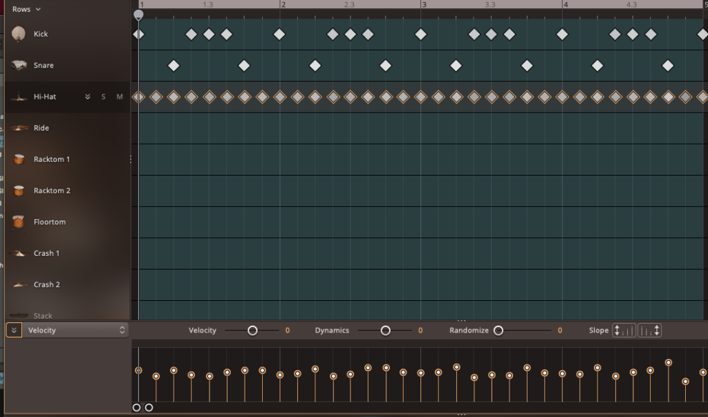 ダイナミクスをゼロにしてからSlopeで調整。ハイハットでこんなことはしないけどスネアやタムでなんかではやりますよね。生っぽい音色かつ、生っぽい打ち込みするのが爆速で出来ます。